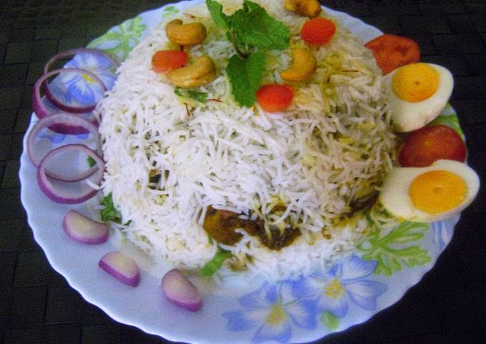 - The last layer should be of the remaining rice and the remaining of the fried onions. While serving, heat through and flip it over on a serving dish..